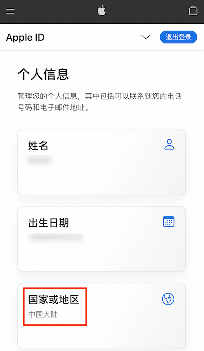 完成手机号码验证后,会出现账号信息,电脑端点击左侧的个人信息,再点击右侧的国家与地区(手机端操作请继续往下看)